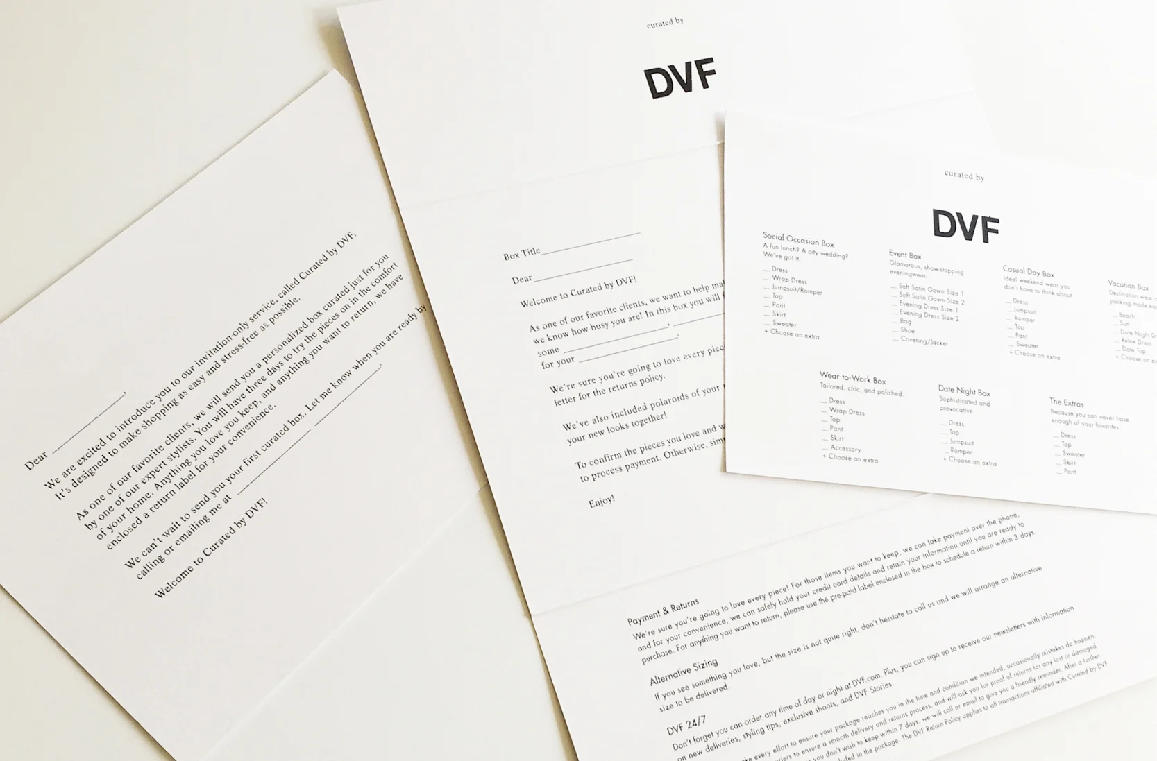 Curated by DVF is an invitation only subscription program offered to top clients of Diane to create an easy and stress-free shopping experience. The packaging program includes a postcard, note pad, and envelope mailed to clients, as well as a box of clothing specifically curated for the clients themselves by our DVF store stylists.